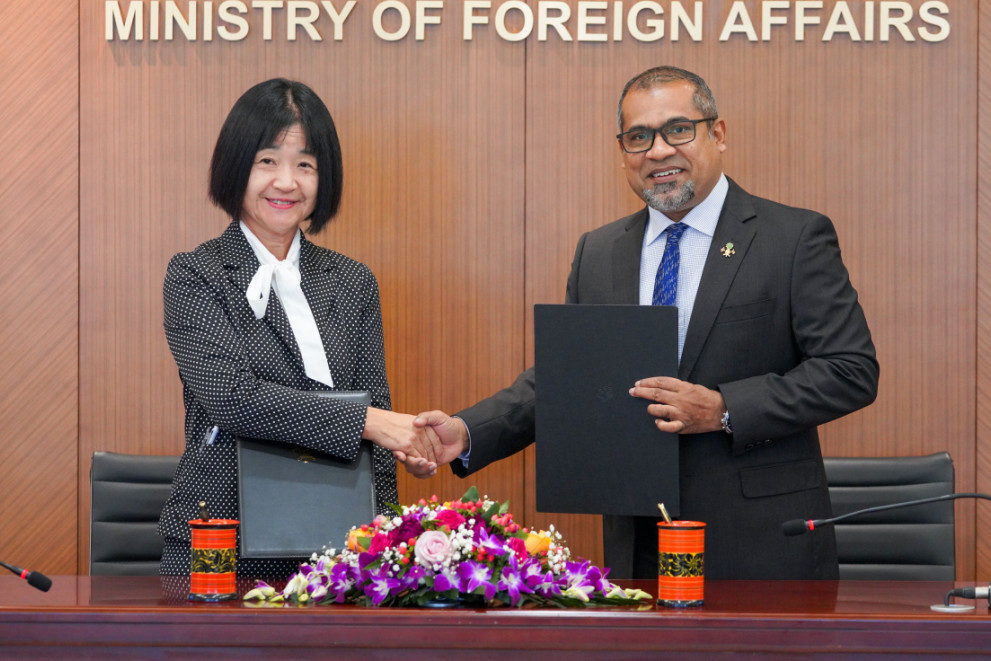 ރާއްޖޭގެ ފޮރިން މިނިސްޓްރީގައި އޮތް ރަސްމިއްޔާތެއްގައި ދިވެހި ސަރުކާރުގެ ފަރާތުން އެއްބަސްވުމުގައި ސޮއިކުރެއްވީ ފޮރިން މިނިސްޓަރު ޑރ. އަބްދުﷲ ޚަލީލް އެވެ. ޖަޕާން ސަރުކާރުގެ ފަރާތުން ސޮއިކުރެއްވީ ރާއްޖޭގައި ހުންނަވާ ޖަޕާން ސަފީރު އިޝިގާމީ ރުމީކޯ އެވެ.
