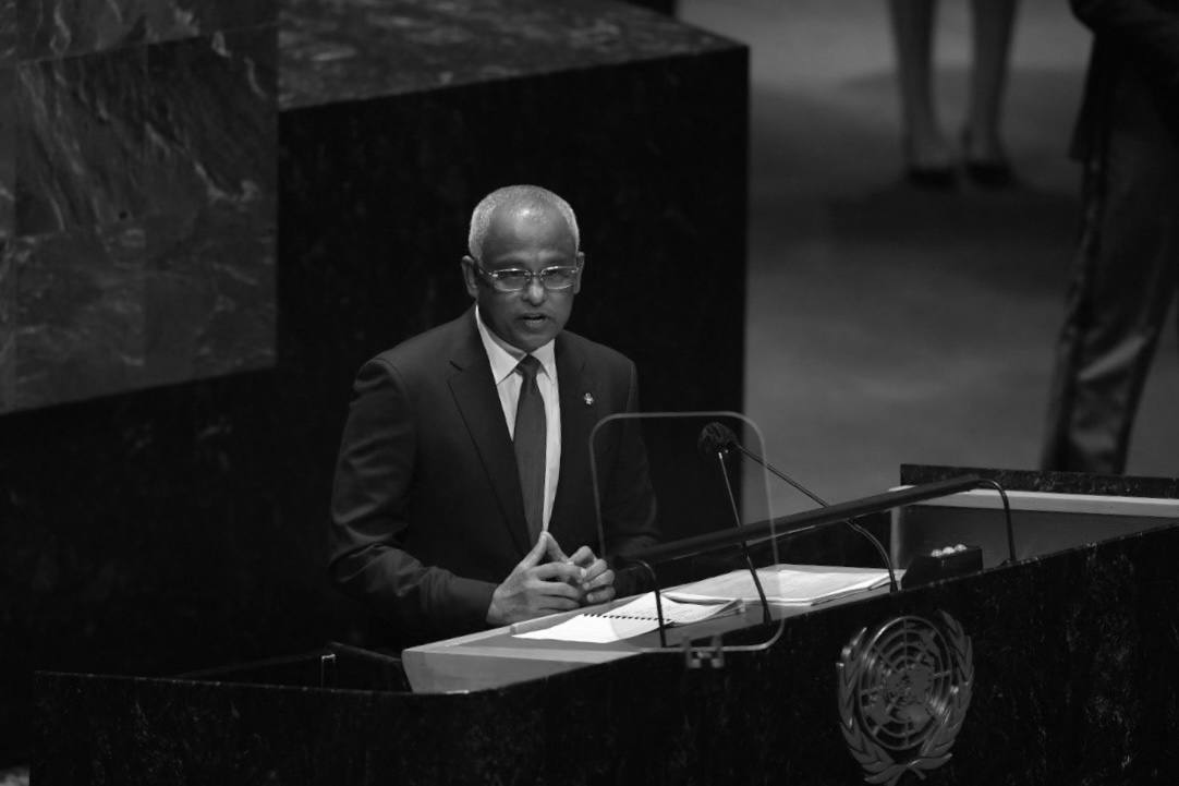 އ.ދ. ގެ 76 ވަނަ އާންމު މަޖިލީހުގައި ދެއްވި ތަގުރީރުގައި ރައީސް ވިދާޅުވީ، ދުނިޔެއަށް ދިމާވެފައިވާ އެންމެ ބޮޑެތި ނުރައްކާތަކާއި ގޮންޖެހުމުގެ ވާހަކަތަކުން ފަށާނަމަ، ލިސްޓުގެ ކުރި ހޯދާނީ ޓެރަރިޒަމް ކަމަށާއި ދިވެހިރާއްޖެއަކީ ފެށުނީއްސުރެ މެދުމިނުގެ ދީނީ ޢަގީދާ ގަބޫލުކުރާ ގައުމެއް ކަމަށެވެ. ނަމަވެސް ހަރުކަށި ފިކުރުން މި ކުޑަކުޑަ ރާއްޖެވެސް ސަލާމަތެއްނުވި ކަމަށާއި މި އަހަރުގެ މޭ މަހުގެ 6 ވަނަ ދުވަހު، ރައްޔިތުންގެ މަޖިލީހުގެ ރައީސް މުޙައްމަދު ނަޝީދު އަވަހާރަކޮށްލަން ދިން ޙަމަލާއަކީ، ދިވެހި ބިމުގައި ދެވުނު ބޮޑު، ނުރައްކާތެރި ޓެރަރިސްޓް ހަމަލާއެއް ކަމަށް ވާއިރު މިފަދަ ހަމަލާ ދޭތަން ބަލަން، އަދި ޅަކުދިންގެ ސިކުނޑިތަކުގައި ހަރުކަށި ފިކުރު އަށަގަންނުވާތަން ދެކެން ނުތިބޭނެ ކަމަށް ރައީސް ވިދާޅުވިއެވެ.