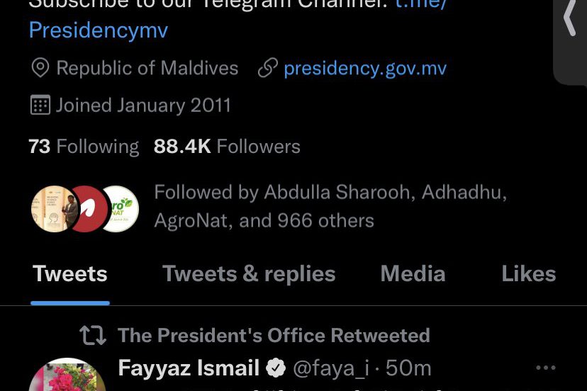 އެމްޑީޕީގެ ޗެއާޕާސަން ކަމަށް ވާދަކުރައްވާ އިކޮނޮމިކް މިނިސްޓަރު ފައްޔާޒު އިސްމާއީލް، އޭނާގެ ކެމްޕެއިނާ ގުޅޭގޮތުން ކުރެއްވި ޓްވީޓެއް ރައީސް އޮފީހުގެ އޮފިޝަލް ޓްވިޓާ އެކައުންޓުން ރިޓްވީޓް ކުރެވުނީ އޮޅުމެއްގެ ތެރެއިން ކަމަށް އެ އޮފީހުން ބުނެފިއެވެ.
