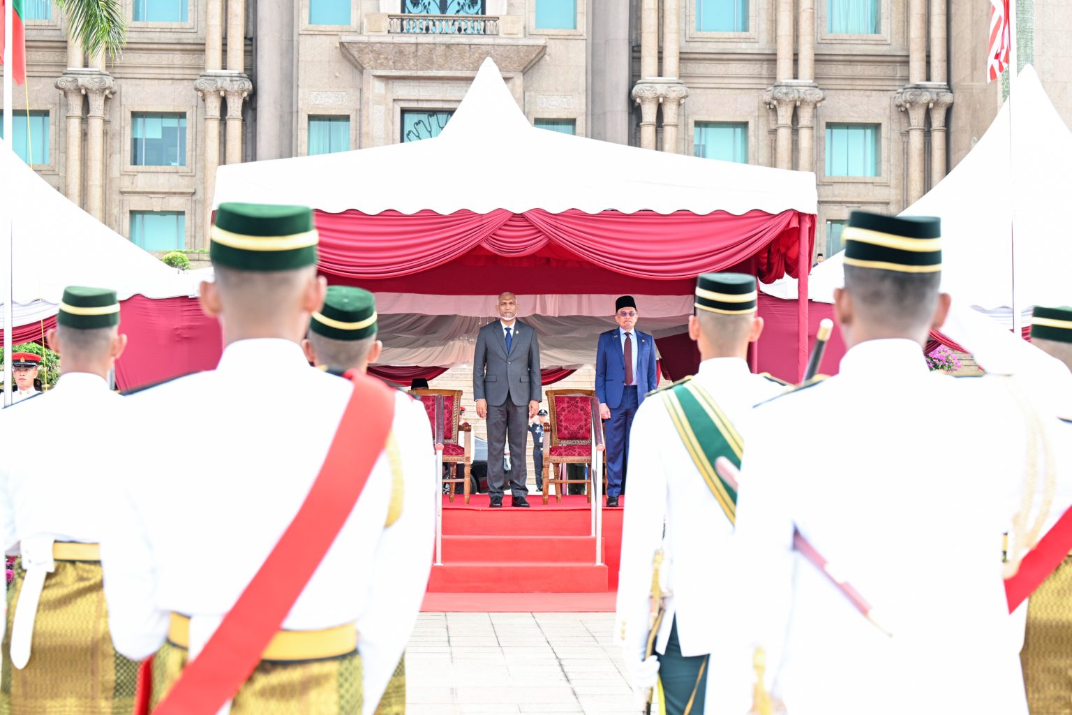 ރައީސް ޕުތުރަޖަޔާއަށް ވަޑައިގަތުމުން މަރުޙަބާ ވިދާޅުވީ، މެލޭޝިއާގެ ބޮޑުވަޒީރު އަންވަރް އިބްރާހީމެވެ. މި ރަސްމިއްޔާތުގައި ރައީސުލްޖުމްހޫރިއްޔާ ވަނީ އެމަނިކުފާނުގެ ޝަރަފުގައި އޮތް ޝަރަފްގެ ގާޑް، އިންސްޕެކްޓް ކޮށްދެއްވާފައެވެ. އަދި އެއަށްފަހު މެލޭޝިއާގެ އަސްކަރީން ދެ ޤައުމުގެ ޤައުމީ ސަލާމް ކުޅެފައިވެއެވެ.