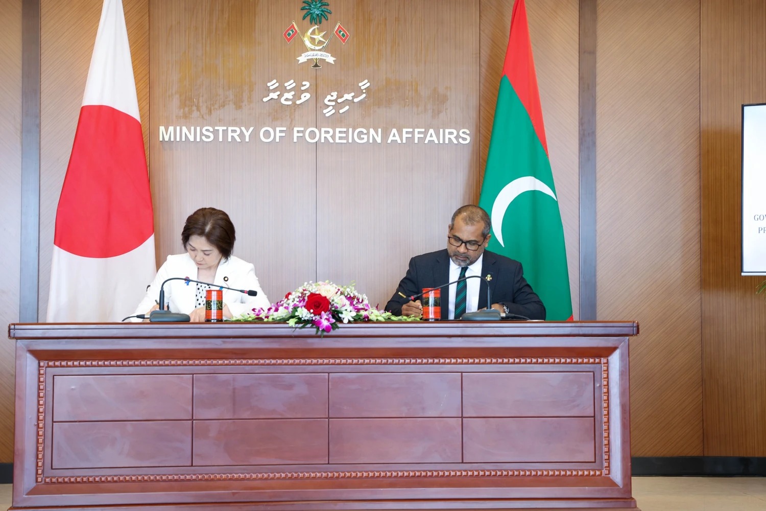 ޚާރިޖީ ވުޒާރާގައި މިއަދު ހެނދުނު ބޭއްވި ރަސްމިއްޔާތުގައި ދިވެހި ސަރުކާރުގެ ފަރާތުން ސޮއިކުރެއްވީ ޚާރިޖީ ވަޒީރު ޑރ. ޢަބްދުﷲ ޚަލީލް އެވެ. ޖަޕާން ސަރުކާރުން މި "އެކްސްޗޭންޖް އޮފް ނޯޓްސް" ގައި ސޮއިކުރެއްވީ ރަސްމީ ދަތުރުފުޅެއްގައި ރާއްޖެ ވަޑައިގެން އުޅުއްވާ ޖަޕާނުގެ ބޮޑުވަޒީރުގެ ޚާއްސަ މަންދޫބު، ޕާލަމަންޓްރީ ވައިސް މިނިސްޓަރ ފޮރ ފޮރިން އެފެއާޒް މިސް އިކުއިނޯ އަކިކޯ އެވެ.