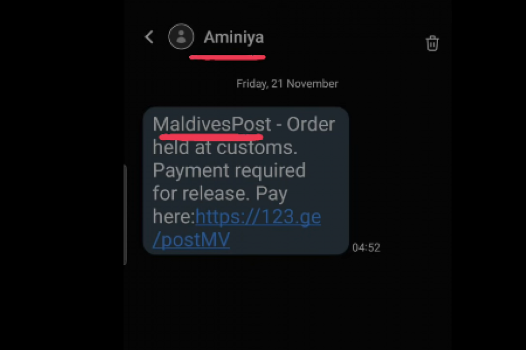 ފުލުހުން ބުނީ "އަމީނިއްޔާ"ގެ ނަމުގައި ކަސްޓަމްސްގައި އޯޑަރެއް ހިފަހައްޓާފައިވާ ކަމަށް ބުނެ ލިންކެއް ހިމެނޭ މެސެޖެއް ގިނަ ބަޔަކަށް ފޮނުވަމުންދާ ކަމަށެވެ. އަދި ކަސްޓަމުން އެ އޯޑަރު ދޫކުރުމަށް ފައިސާ ދެއްކުމަށް ވެސް އެ މެސެޖުގައިވެ އެވެ.